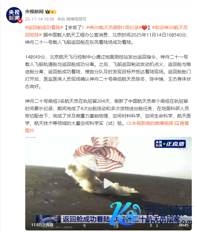 据中国载东谈主航天工程办公室音尘,北京时期2025年11月14日16时40分,神舟二十一号载东谈主飞船复返舱在东风着陆场收效着陆。