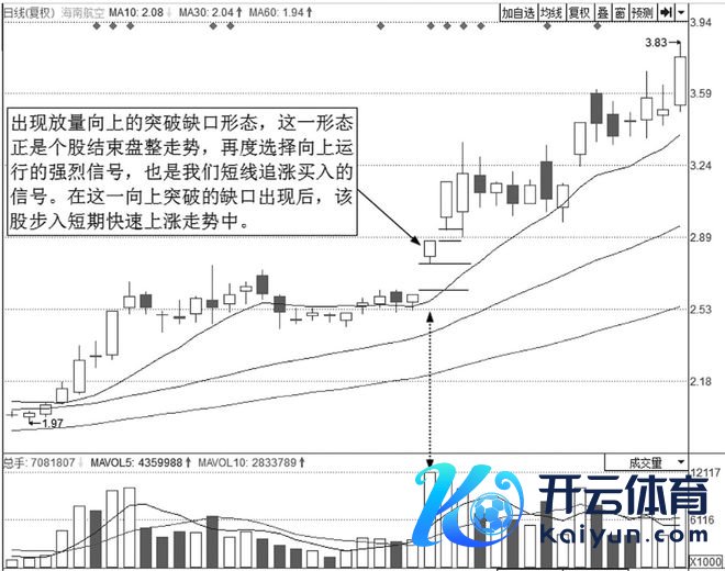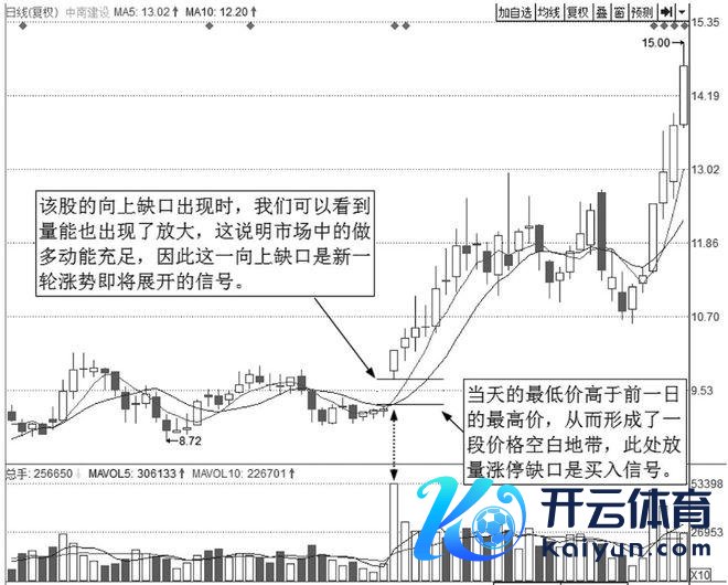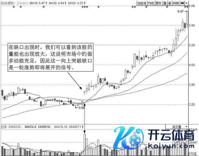 图1-3是武钢股份(600005)的日K线图,图中箭头处该股高开高走,并生效地封高潮停板,在日K线图上出现了一个巨大的跳空空缺。再不雅察一下该股的成交量就不错看到,出现跳空缺口的同期,成交量出现很是放大的迹象,不错展望后市还有较大涨幅,咱们不错积极跟进。后市该股尽然看守了较强的升势,涨幅不小。