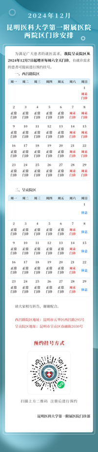 为抓续改善医疗办事,充分反馈国度对于改善就医感受、进步患者体验主题行径和《云南省卫生健康功绩高质地发展三年步履筹画(2023—2025年)》条目,进一步鼓吹昆明医科大学第一从属病院西昌路院区、呈贡院区同质化管束,2024年12月7日,在病院西昌路院区终年开设周末人人门诊的基础上,病院呈贡院区厚爱启动了周六人人门诊。这一新举措的推出,不仅使责任日接力的上班族、学生及外地患者偶然在周末享受到优质高效的专科医疗办事,还进一步罢了了医疗资源的合理分派与高效诳骗。