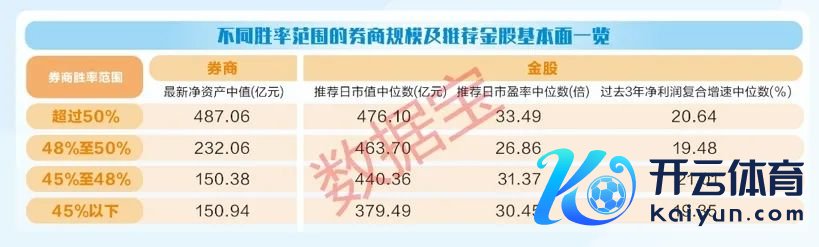 从基本面来看,胜率较高的券商,其保举的金股市值赫然更大。具体来看,胜率超50%的券商,其保举见解市值中位数(保举日)独特470亿元;胜率位于45%以下的券商,保举见解市值中位数低于380亿元。从估值来看,胜率独特50%的券商,其保举的金股估值相对较高,中值独特33倍;胜率低于45%的券商,保举的金股估值中位数30倍驾驭。从功绩成长性来看,胜率独特50%的券商,保举的金股夙昔3年(罢休保举年份)净利润复合增速在20%以上,胜率低于45%的券商,其保举金股净利润复合增速相对偏低。