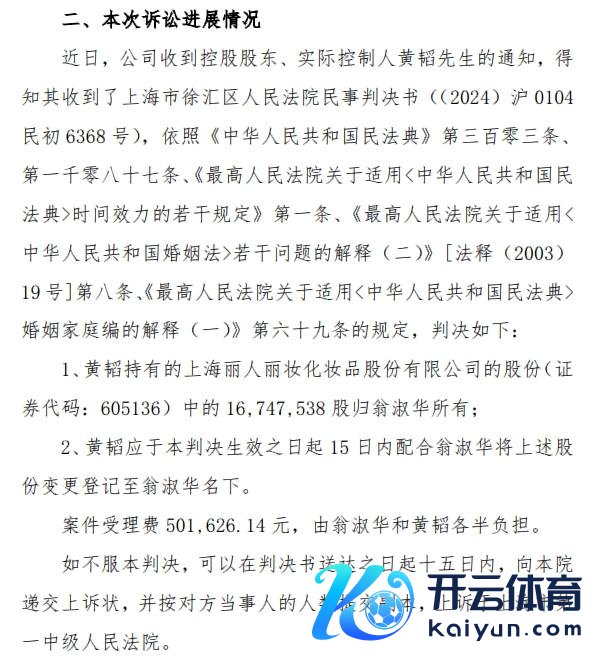 2023 年 11 月 21 日,丽东说念主丽妆公告,法院已对黄韬与翁淑华离异纠纷作出身效判决,裁定共冻结黄韬抓有的 1000 万股公司股份。
