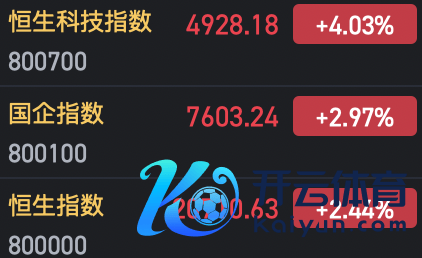 2月4日音信,港股三大指数高开高走,适度发稿,恒指涨2.44%,科指涨4.03%尊龙凯时体育,国企指数涨2.97%。好意思团涨超5%,小米涨超4%,远洋集团、万国数据涨超20%。