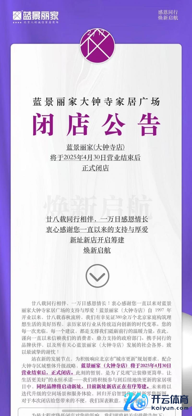 凭证蓝景丽家闭店公告,蓝景丽家(大钟寺店)自1997年开业以来,亲历家居行业从传统迈向更动的时期变革。为反馈北京市“城市更新”策画要求,合营大钟寺区域举座升级计策,其运营逾28年的大钟寺店将于2025年4月30日营业欺压后,老成闭店。